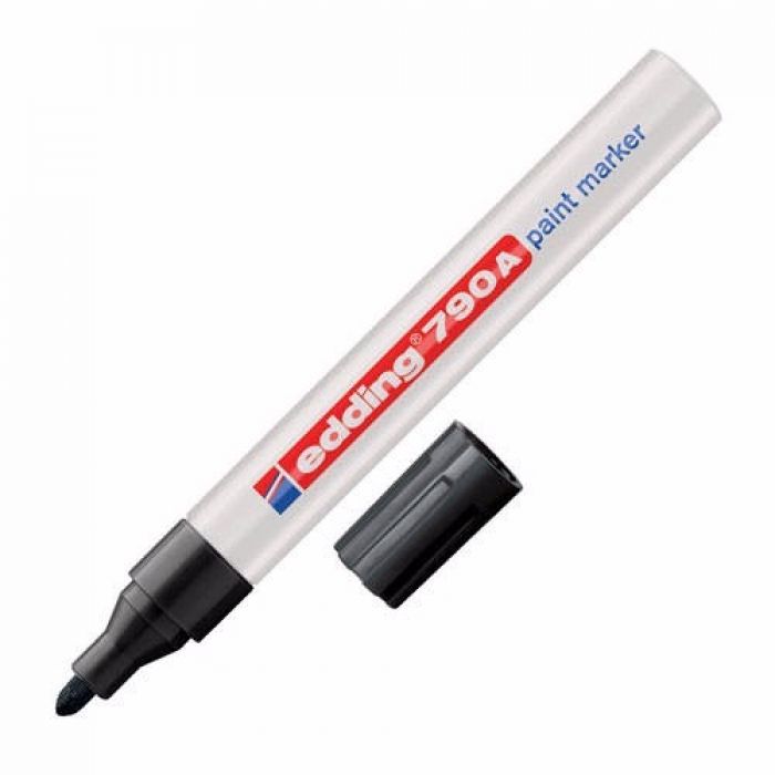 El marcador Edding 790A es de tinta pigmentada blanca con efecto lacado, altamente cubriente y visible incluso sobre superficies oscuras y transparentes. Tiene cuerpo redondo, se cierra con tapa para que no se seque y el grosor del trazo es de 2-4 mm.
