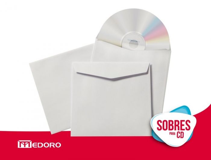 Sobre para CD/DVD Medoro confeccionado en papel obra blanco 80 gramos. Sin ventana. Con solapa sin engomar.Material: papel obra blanco. Medidas: 12.7 x 12.7 cm. Pack x 250.